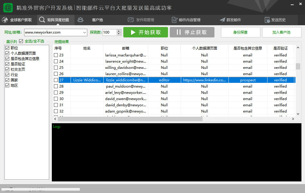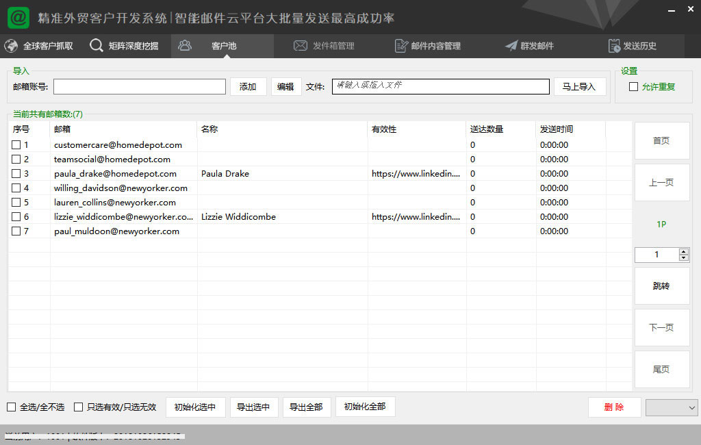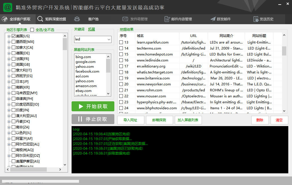 对获取的网站进行二次并发深度抓取:自带邮箱验证、客户池管理、开发信群发、邮件追踪、邮件回执、发送记录等强大的客户营销功能。